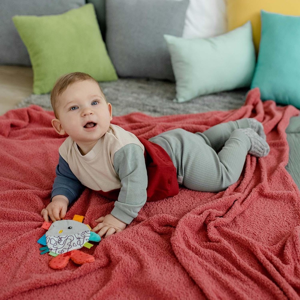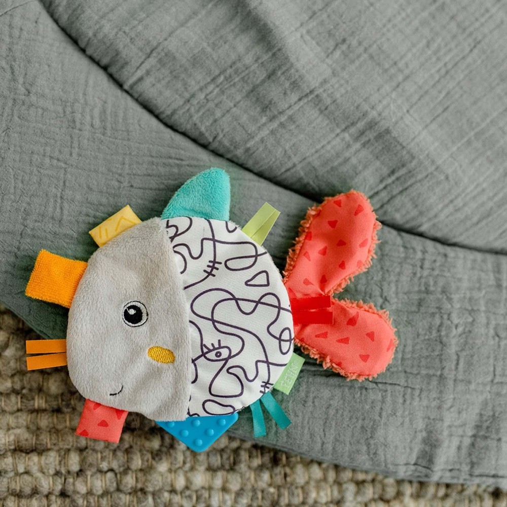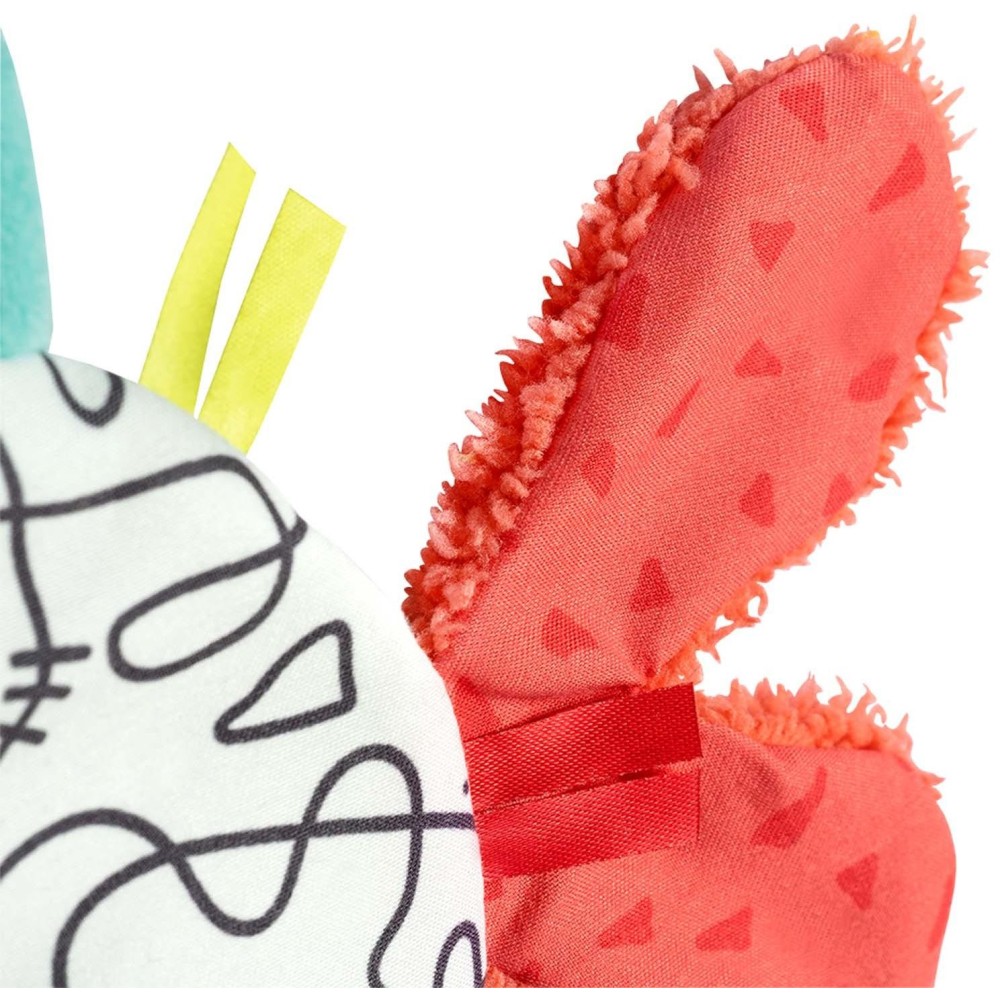 Plyšové chrastítko se spoustou aktivity prvků jako je praskací papír, kousátko, mix materiálů. Hračka na uchopení hravě podporuje sluch dítěte, smysl pro zrak, hmat, zdravé uchopení – ideální jako dáreček pro chlapce a dívky k narození, narozeninám či křtu.