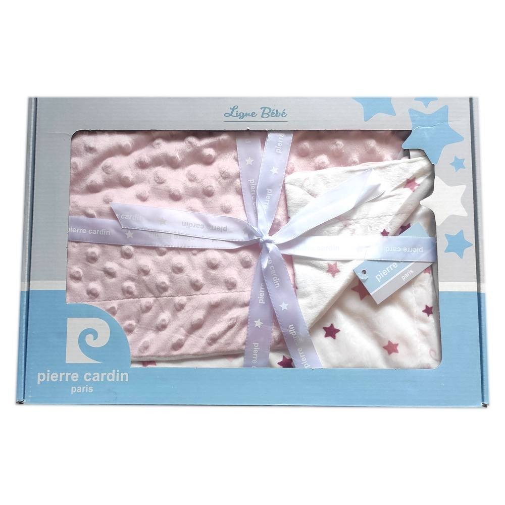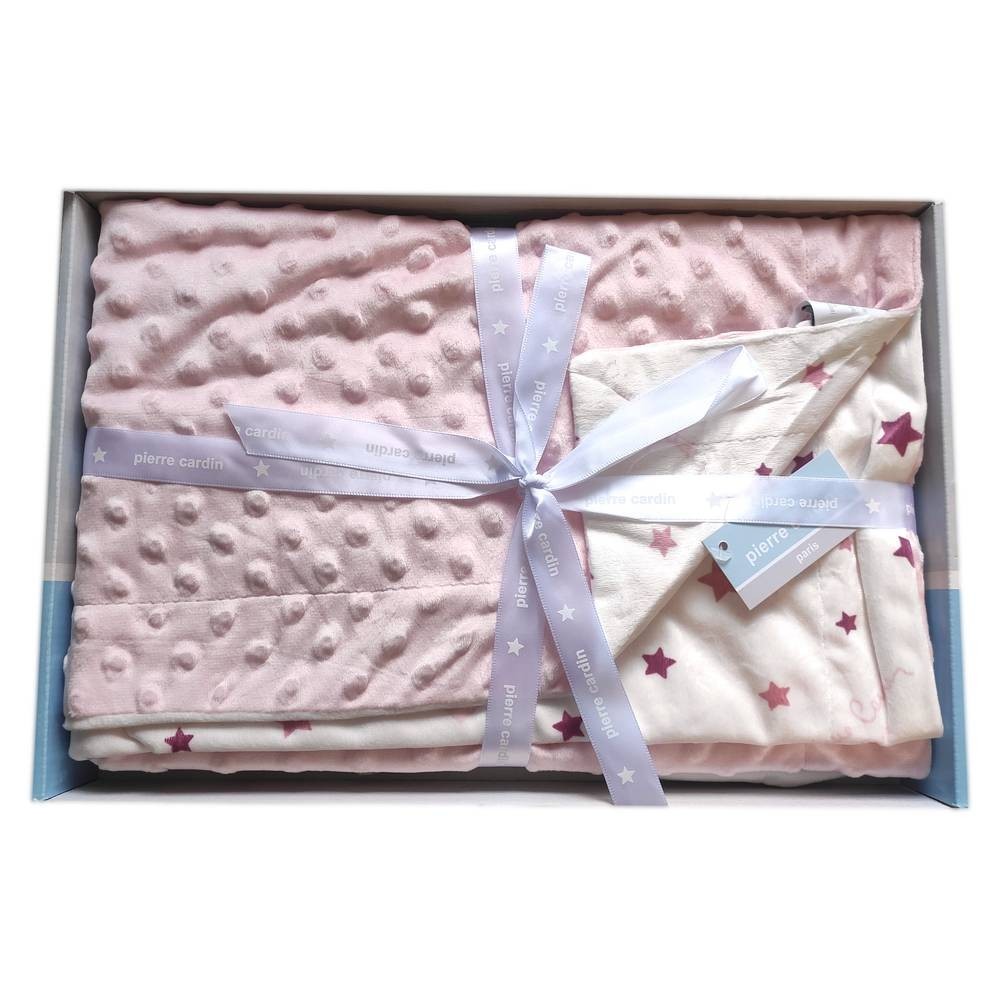 Dětská oboustranná deka je z polyesteru s počesanou úpravou s růžovými hvězdičkami na bílém podkladu a opačná strana je z materiálu MINKY s vytlačenými 3d puntíky.