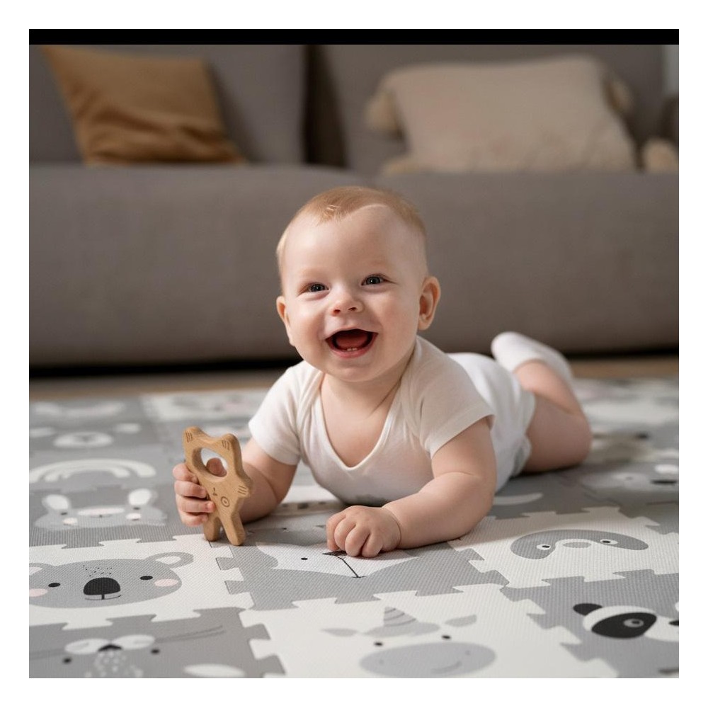 Pěnové puzzle je vyrobené z kvalitní EVA pěny. Plní funkci nejen podložky, která zajistí pohodlí díky izolaci od chladu, ale zároveň praktické pomůcky pro první měsíce miminka, kdy poskytuje měkkou oporu při pasení koníčku nebo prvním lezení.