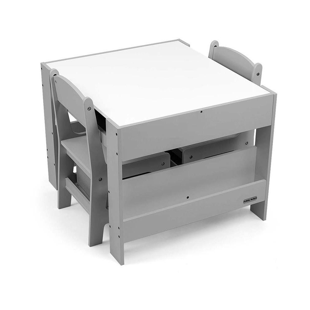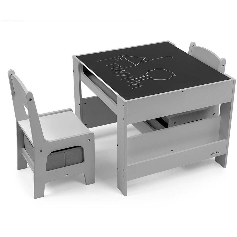 Multifunkční sada nábytku pro děti. Stůl SVEN se 2 židlemi v bílé a šedé barvě s šedými doplňky je vyroben tak, aby dětem poskytoval: pohodlí, prostor pro kreativní hru, malování, psaní a maximální komfort při činnostech. Sada obsahuje 2 židle se 2 látkovými úložnými pomůckami zasunutými do police pod židlemi. Stůl je vybaven obrovským úložným prostorem umístěným pod oboustrannou odnímatelnou deskou. Má také boční úložné police. Na jedné straně desky stolu je velká kreslicí deska. Židle jsou lehké a děti s nimi mohou volně pohybovat. Nábytek je vyroben s výjimečnou precizností a pečlivostí. Obě židle mají zaoblené rohy, které chrání dítě před zraněním. Všechny prvky konstrukce stolu a židlí zajišťují vysokou stabilitu a minimalizují riziko pádu. Souprava Sven vyrobená z MDF je odolná a snadno se udržuje. Sada nábytku se snadno sestavuje a všechny součásti potřebné k montáži jsou součástí balení.
