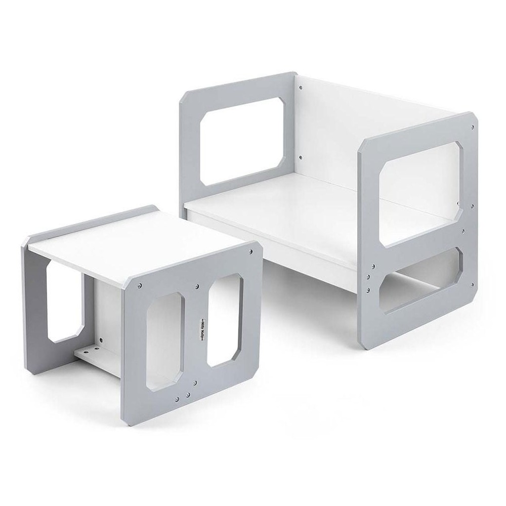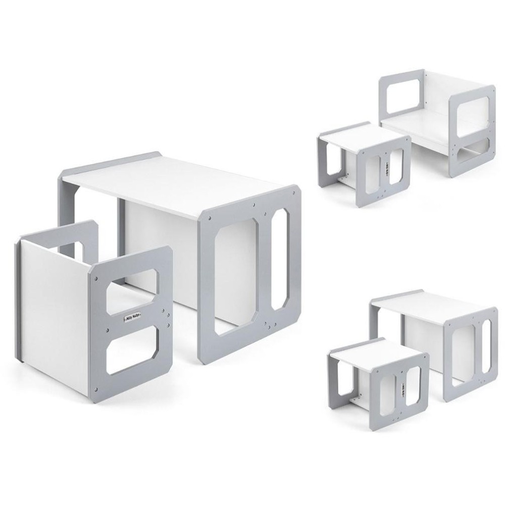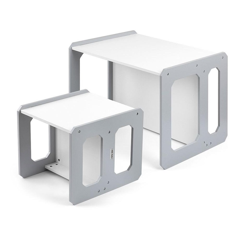Sada se skládá z jednoho stolku a jedné židličky, které díky modulární konstrukci mohou plnit různé funkce – stolek lze proměnit ve větší sedadlo a židlička se dokonale hodí jako menší stolek nebo sedátko bez opěradla pro starší dítě. Díky své lehké konstrukci je tento nábytek snadno přenosný, což umožňuje dětem přizpůsobit si ho podle svých potřeb.