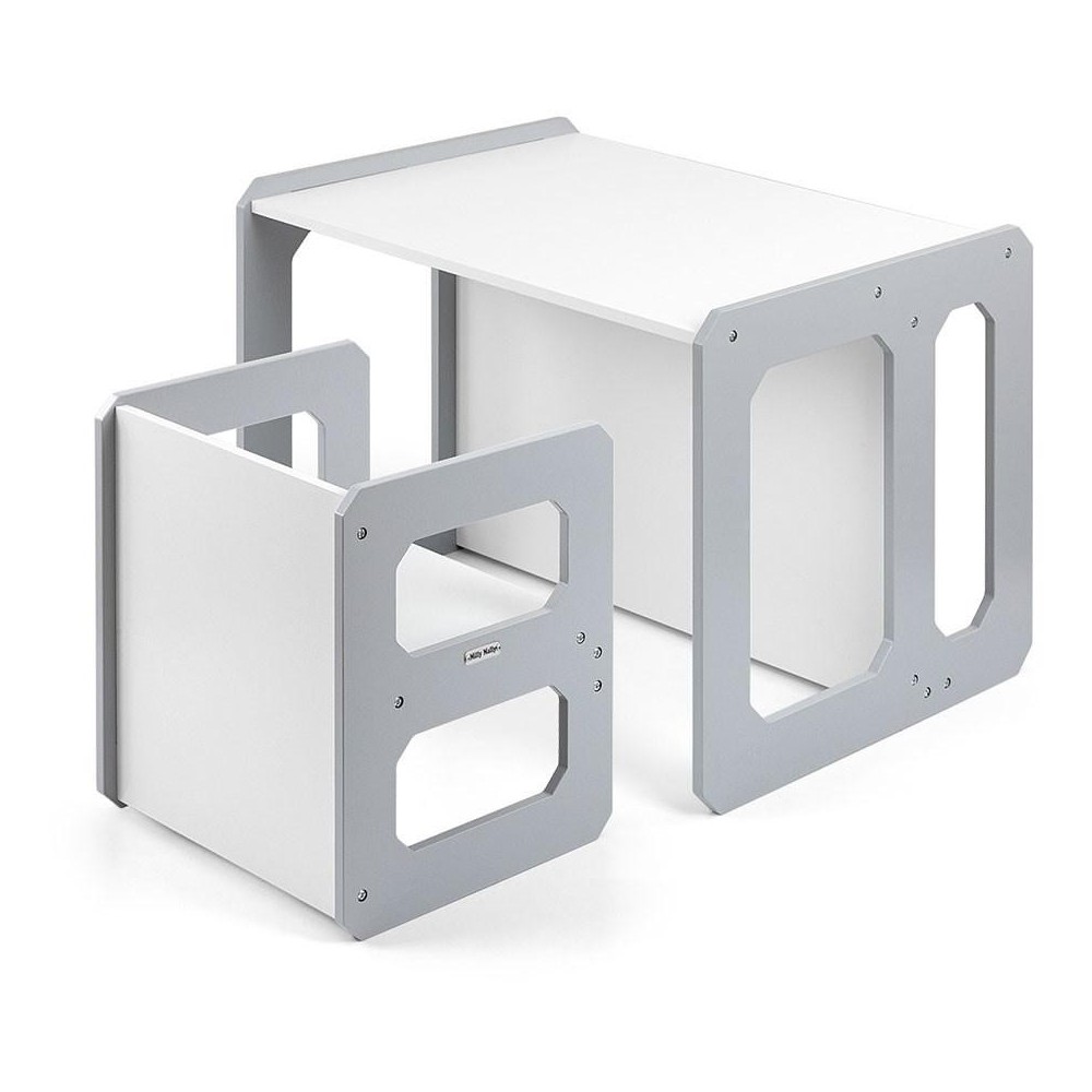 Sada nábytku 3v1 Stella v barevné kombinaci bílé a šedé se šedými doplňky, navržená s ohledem na zajištění dětem: pohodlí, prostoru pro kreativní hraní, malování, psaní a maximálního komfortu během činností.