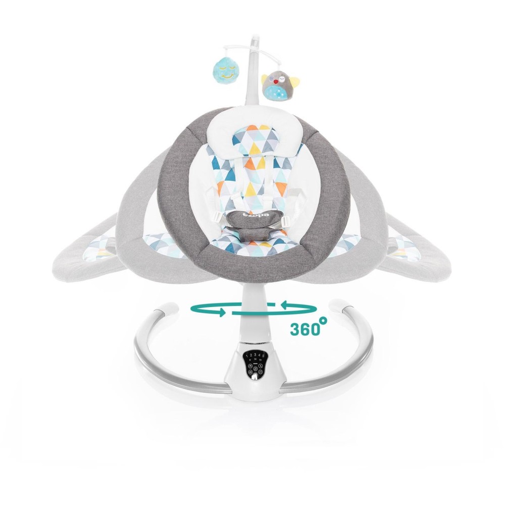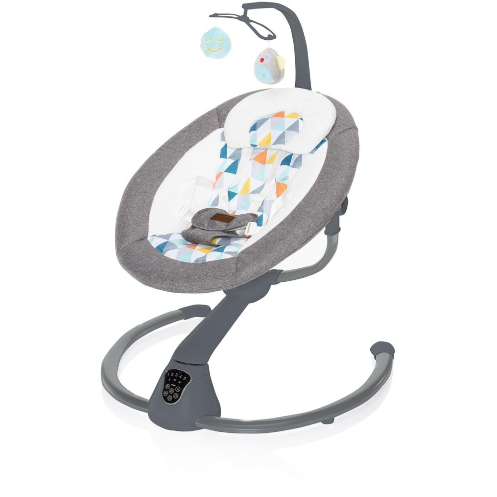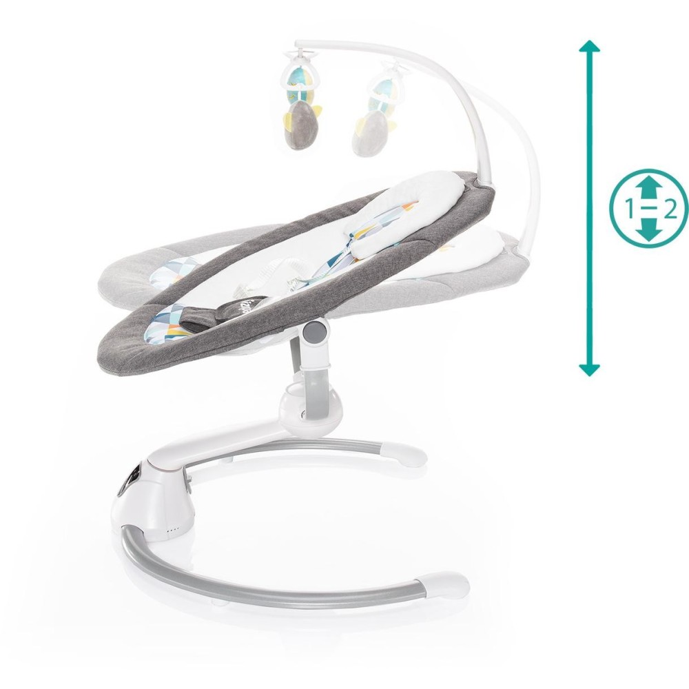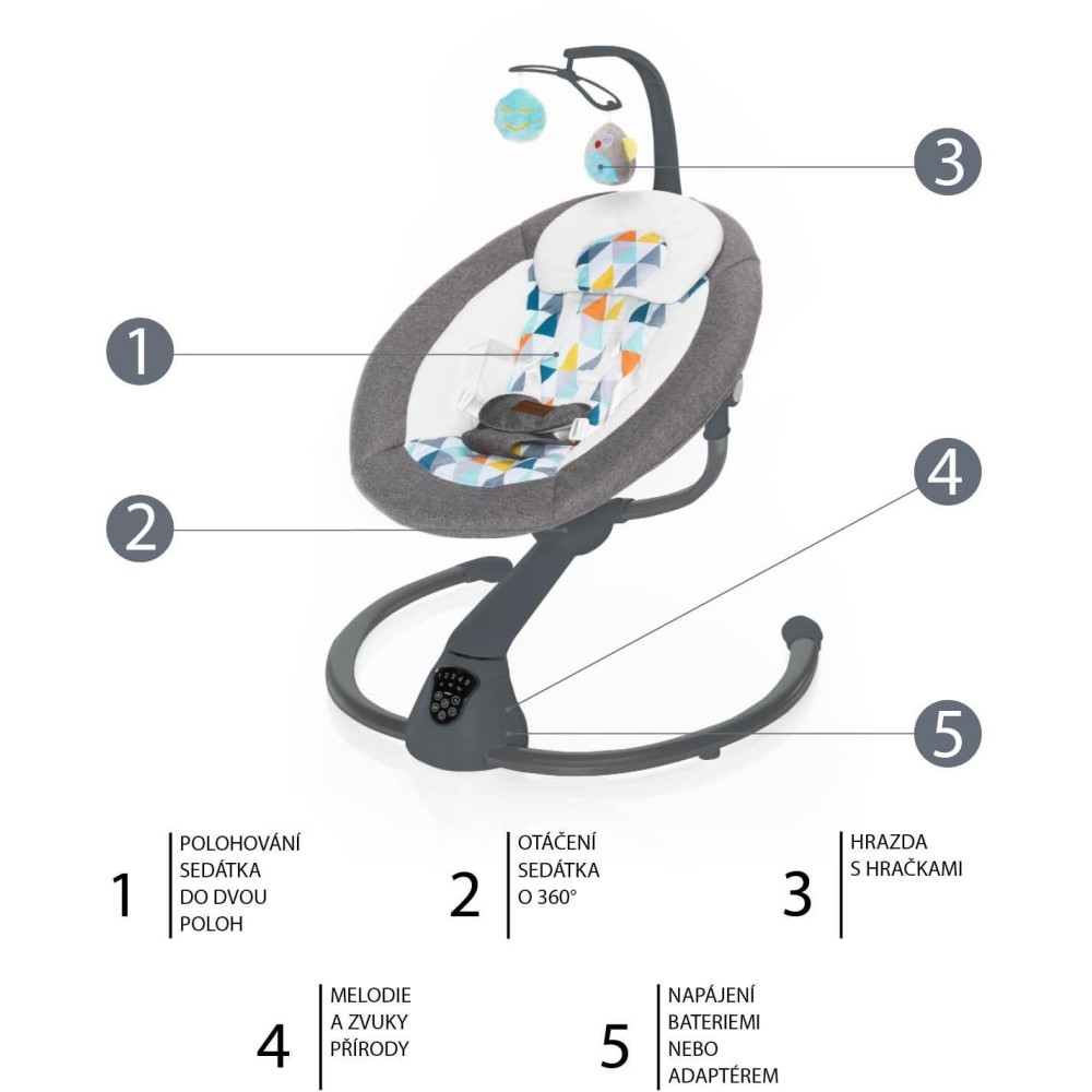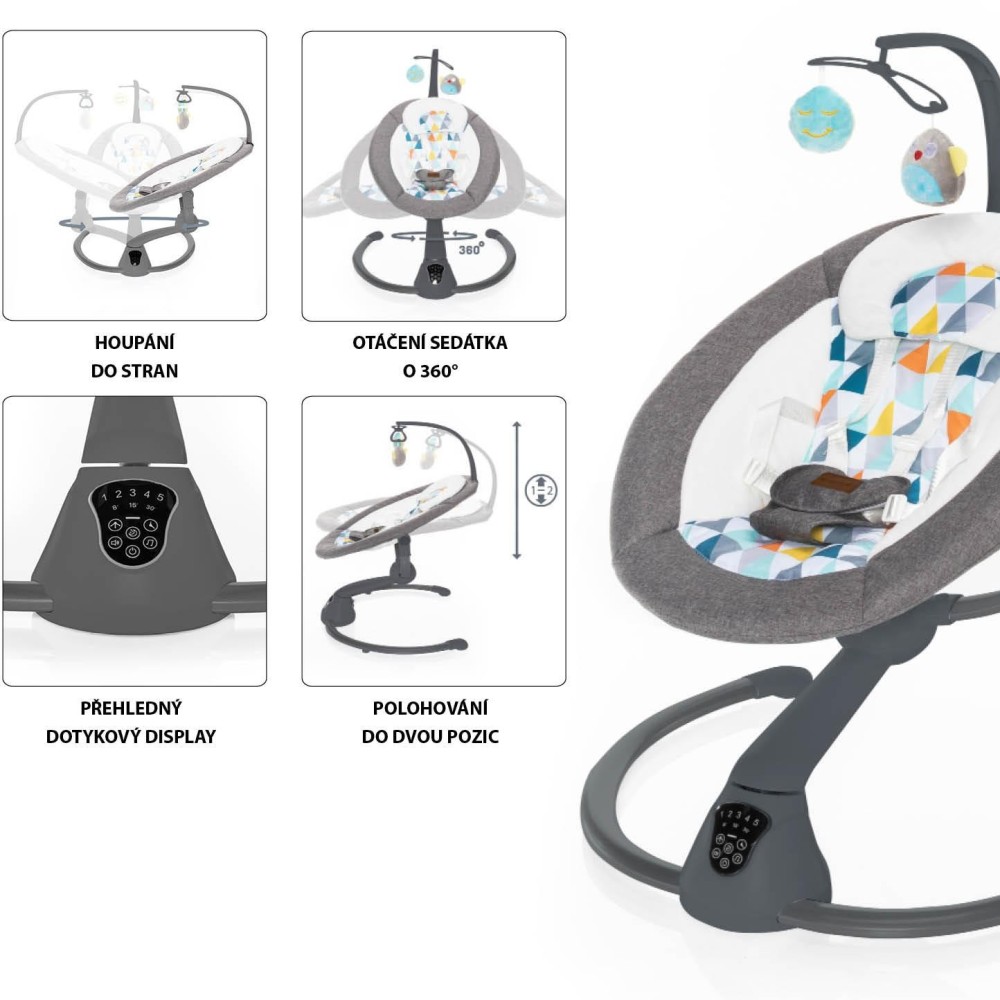 Otáčení o 360°, 5 stupňů intenzity houpání, automatické zapnutí, nastavení doby houpání, dotykový ovládací panel, dálkový ovladač, hrazda s hračkami, 5 bodový bezpečnostní pás, zvuky pro uklidnění – to je multifunkční lehačka Lullaby. Vhodná pro děti od narození do 9 kg.