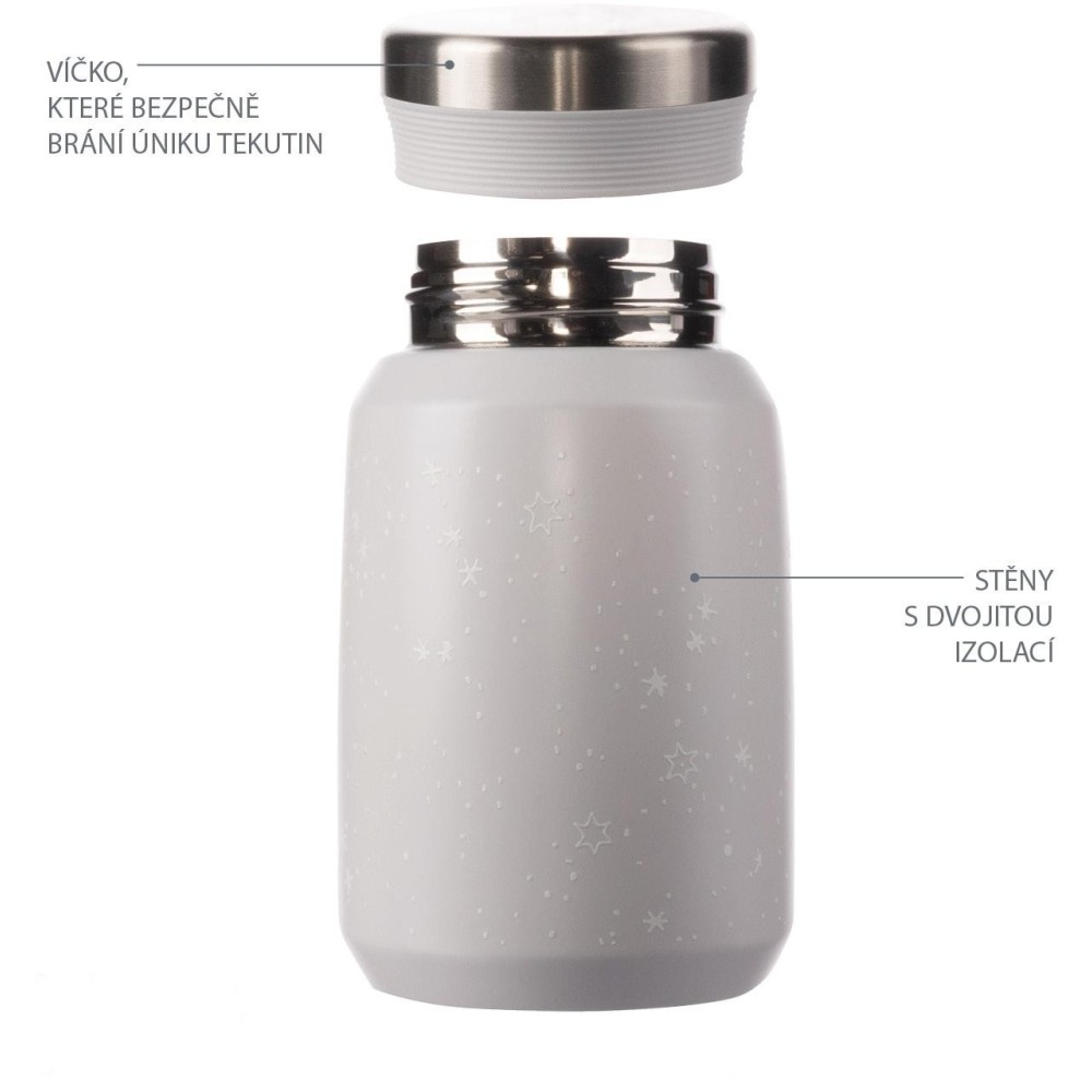 která je odolná vůči korozi. Těsné víčko zajišťuje, že termoska neprotéká. Díky