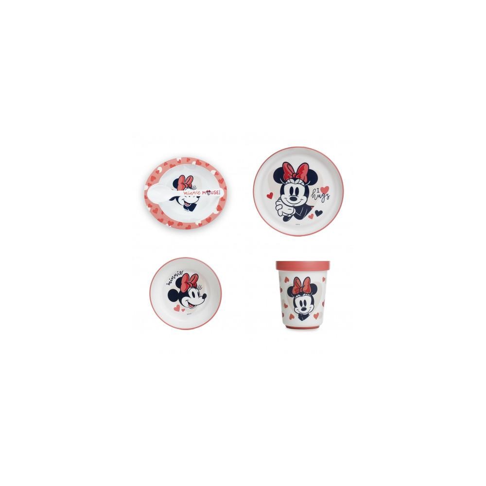 NEZBYTNÁ JÍDELNÍ SADA MINNIE PRO DĚTI OD 2. VĚKU: VELKÝ TALÍŘ, HRNEK, PROTISKLUZOVÁ MISKA A SET PŘÍBORŮ DISNEY MINNIE