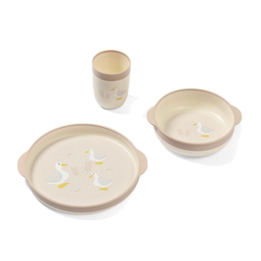 Součástí sady je talíř, miska a hrnek – perfektní pro podávání teplých i studených jídel a učení se pití z otevřeného hrnku.