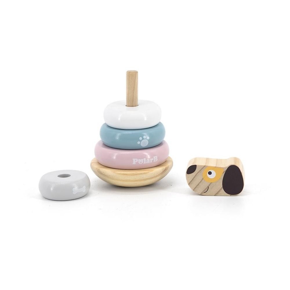 Pastelový pes je vyroben ze 6 disků-bloků různých velikostí a barev, včetně jednoho ve tvaru psí hlavy. V základně je kolíček pro umístění prvků věže. Tato hračka je ideální pro batolata, která začínají skládat kostky. Pyramida podporuje rozvoj koordinace ruka-oko, logického myšlení a navíc podporuje učení rozpoznávání barev.