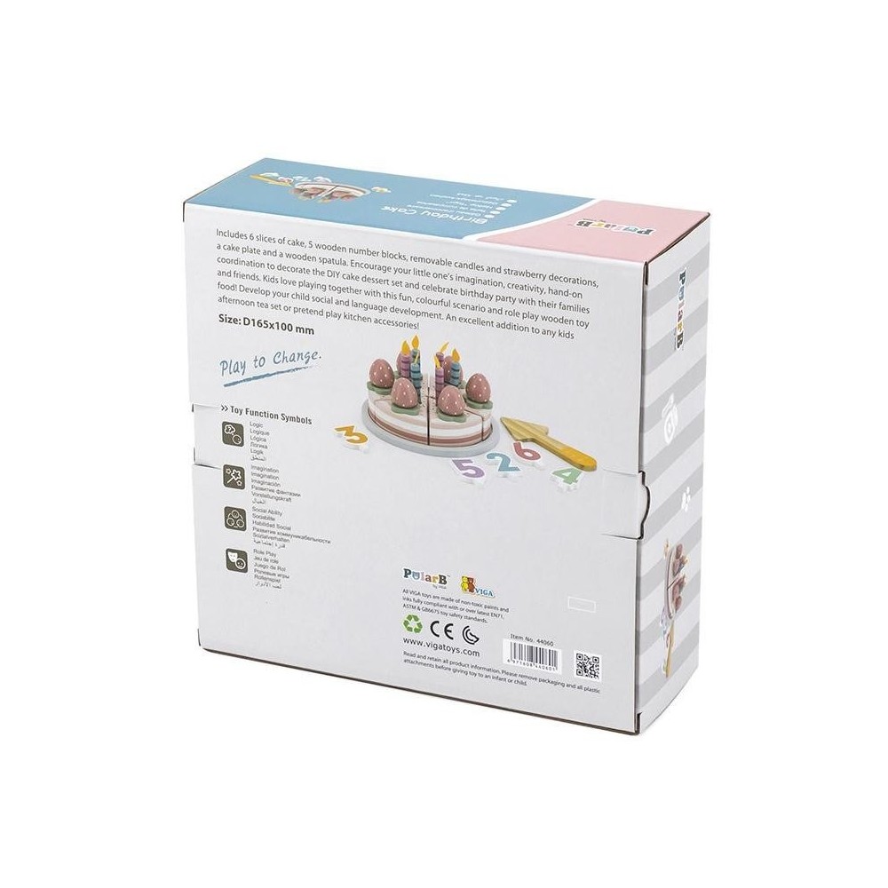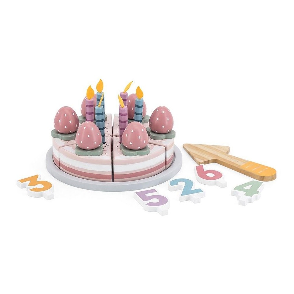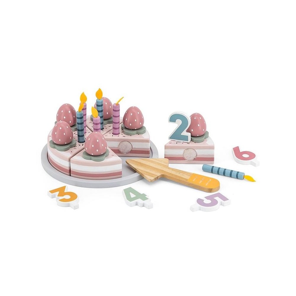 Dřevěný dort je hračka určená nejmenším dětem, které si rády hrají na oslavách a jako doplněk ke kuchyňským soupravám. Podporuje představivost a kreativitu, stejně jako sociální rozvoj a hraní rolí. Sada se skládá z 26 kostek představujících kousky dortu, jahodové ozdoby, svíčky, čísla, talíře a lopatky. Dopřejte si narozeninovou oslavu.