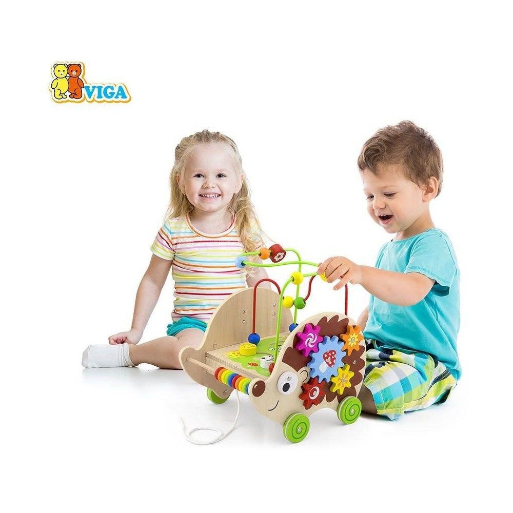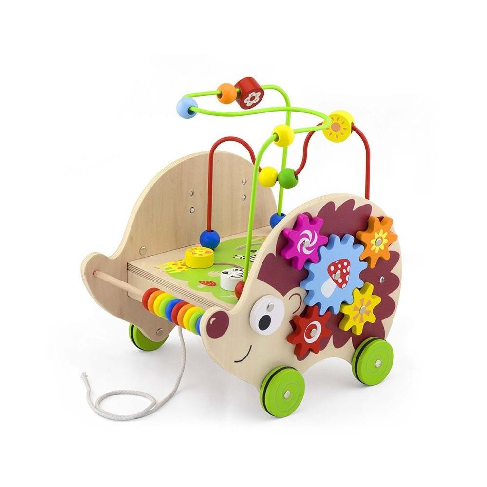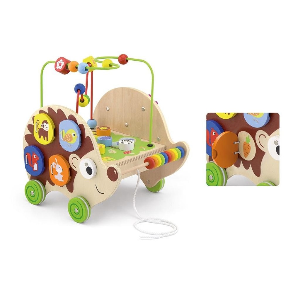 Prostorový labyrint v podobě roztomilého ježka je multifunkční tahací hračka. Ježek poskytne vašemu dítěti hodiny plné zábavných atrakcí. První jsou korálky přímo u ježkova nosu, které lze použít jako počítadlo. Další atrakcí jsou barevné korálky různých tvarů a barev, které lze volně posouvat po kovových tyčích. V dolní části prostorového bludiště se nachází druhá dráha bludiště, kde má batole za úkol správně přiřadit hlavy zvířátek k obrázku, který je třeba najít. Na zadní straně Ježka jsou další atrakce: na jedné straně jsou ozubená kolečka, která přinesou spoustu zábavy každému dítěti; zatímco na druhé straně jsou Ježkovi kamarádi. Pod jejich obrázky se nacházejí pamlsky příslušného zvířátka. Ježek se s vaším dítětem rád vydá na cestu - má šňůrku a kolečka s protiskluzovým uzávěrem.