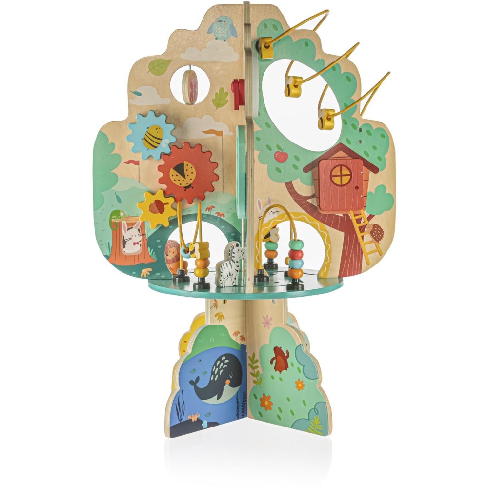 dřevěným herním centrem s Montessori prvky, které podporují rozvoj jemné