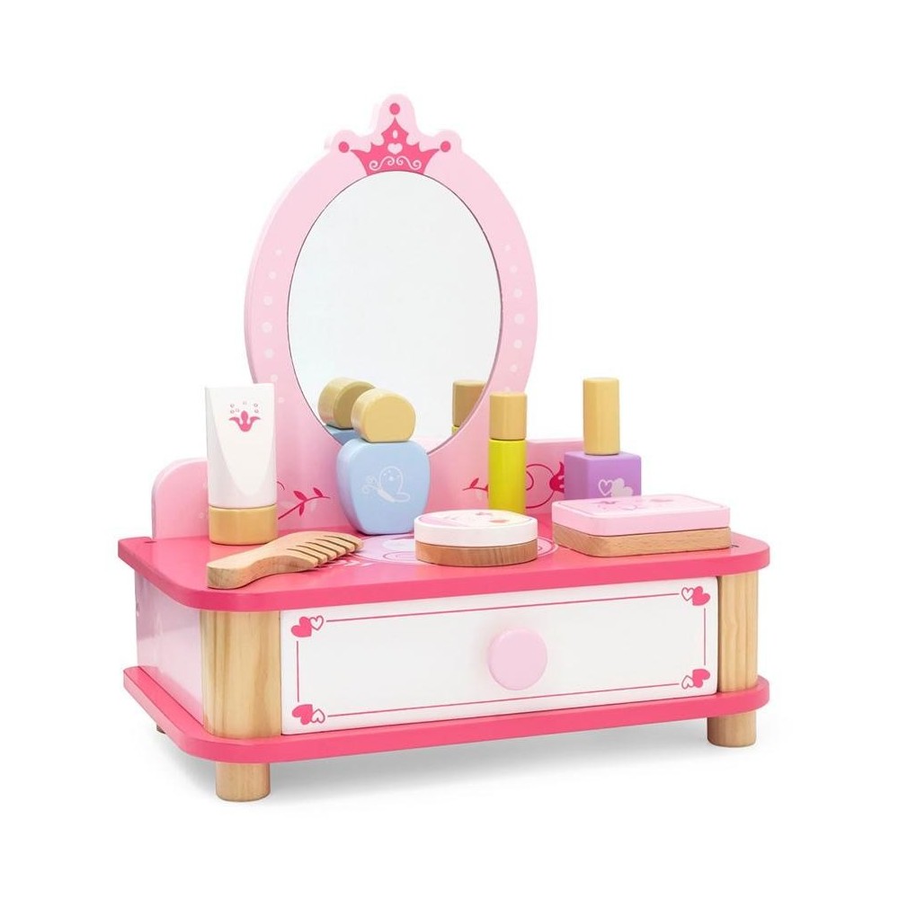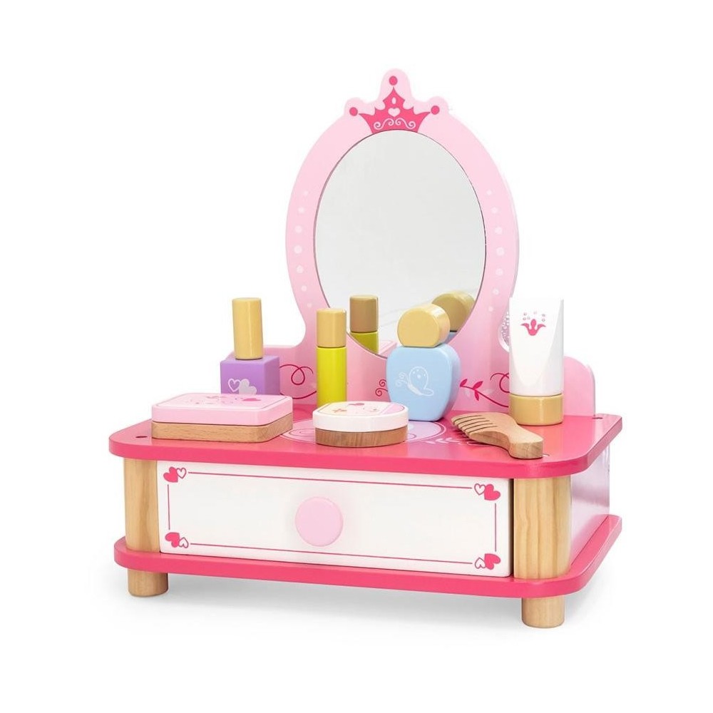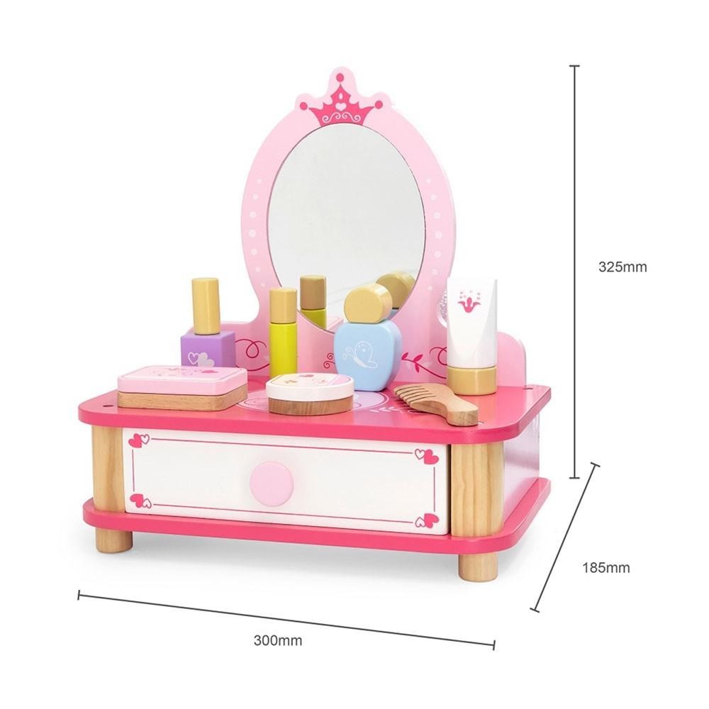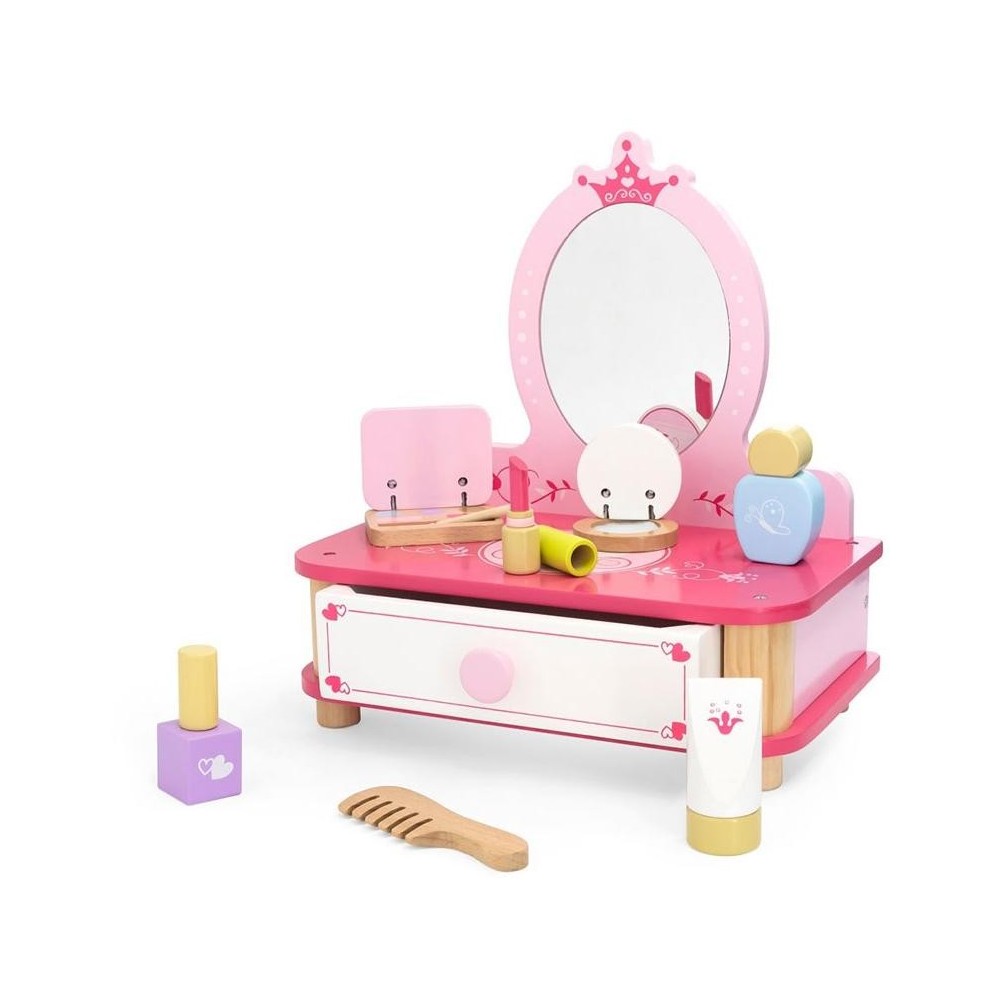 Tato dokonalá toaletka, zdobená roztomilými kresbami srdíček a květin, je přímo vysněným doplňkem pro každou malou dámu. S toaletkou může vytvářet úžasné účesy, make-up nebo hrát si na přeměny. Při hře si dítě rozvíjí svůj smysl pro estetiku. Dřevěný toaletní stolek se zrcadlem je skvělou hračkou pro děti, které milují kreativní hry a rozvíjení fantazie.