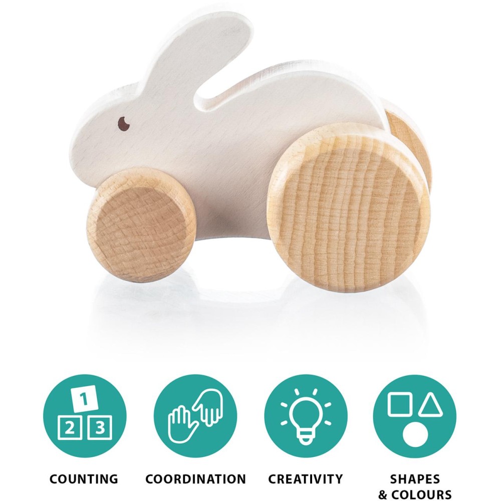 Lehký a kompaktní jezdící králíček je ideální hračkou pro malé dětské ručičky. Je vyrobený z přírodního kvalitního dřeva a natřený barvami na vodní bázi.