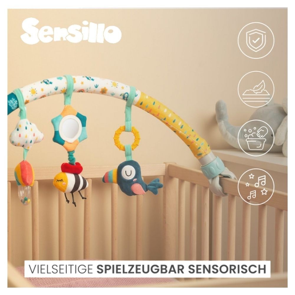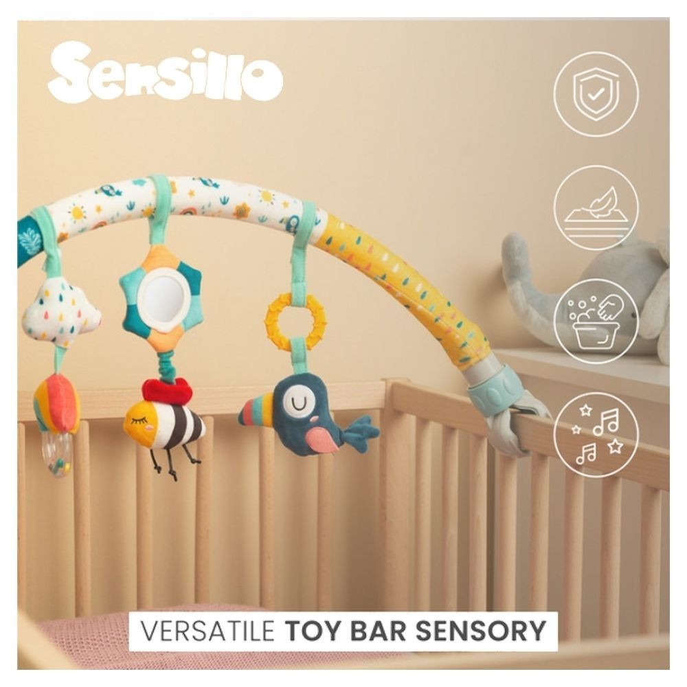 Hrazdička je vybavena různými senzorickými hračkami, jako jsou chrastítka, zrcátko nebo měkké textury, které stimulují smysly dítěte, podporují jemnou motoriku a koordinaci rukou a očí. Hračky lze snadno odpojit a vyprat, což zajišťuje hygienu.