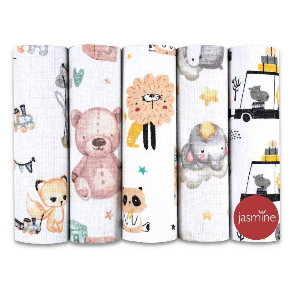 Sada pěti látkových plen Jasmine s motivem Animals 2 je ideální pro každodenní péči o miminko. Vyrobené z jemné 100% bavlny v dutinné vazbě jsou hebké, prodyšné a šetrné k citlivé pokožce. Skvěle poslouží při přebalování, krmení i jako podložka do kočárku nebo postýlky.
