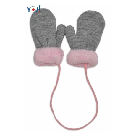 YO! Zimní kojenecké rukavičky s kožíškem - se šňůrkou YO - šedé/růžový kožíšek