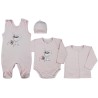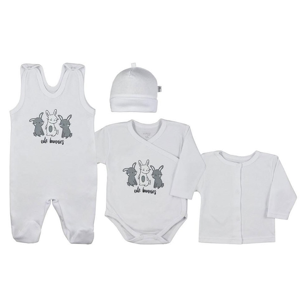 Nádherná bavlněná kojenecká 4-dílná soupravička Koala Rabbit pro miminka. Soupravička je vyrobena z velmi příjemného, měkkého a kvalitního materiálu, který je vhodný pro miminka a je vhodná nejen do porodnice. Obsahuje body s dlouhým rukávkem, dupačky, kabátek a čepičku. Celorozepínací body zdobí obrázek králíčků. Dupačky zdobí obrázek králíčků a zapínání je na cvočky na ramínkách a mezi nožičkama. Kabátek je jednobarevný se zapínáním po celé délce. Čepička má široký pružný lem, který netlačí na hlavičku miminka a krásně kryje oušká miminka. V této soupravičce, která je precizně a kvalitně ušitá se bude miminko cítit velmi příjemně. Složení: 100% bavlna.