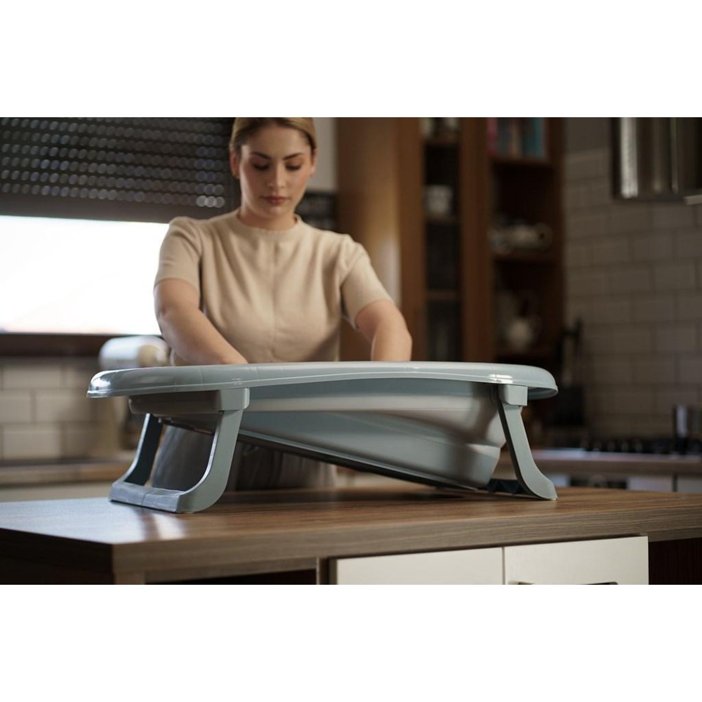 Vanička je vybavena výpustním ventilem a páskovým teploměrem, což výrazně zvyšuje komfort a bezpečnost při každodenním používání. Dá jednoduše složit na výšku pouhých 10 cm, přičemž plastové nožičky se sklopí přímo pod vaničku – díky čemuž zabírá minimum místa a je ideální pro skladování i v menších prostorách.