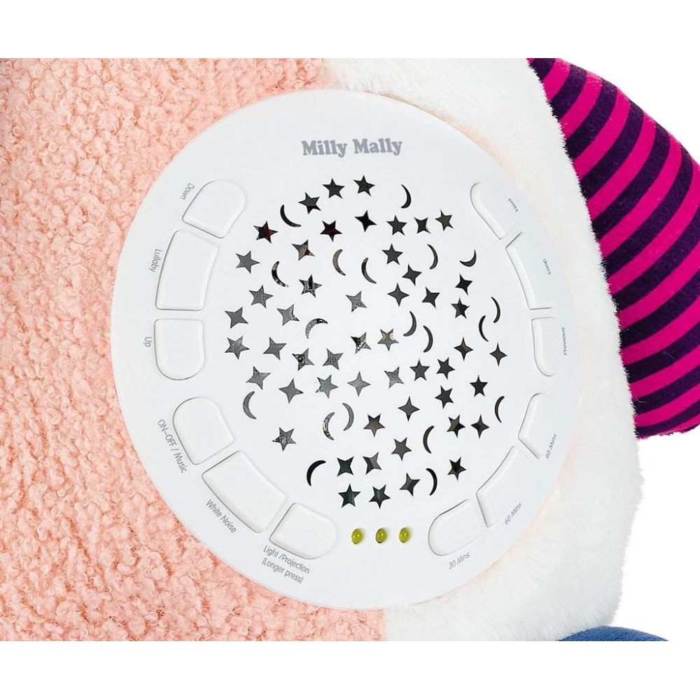 Můžete nastavit vhodnou dobu trvání: 30, 60, 90 minut. K dispozici je 5 úrovní hlasitosti. Skvělým doplňkem jeho funkce je 5 druhů bílého šumu, který má na batole obzvláště uklidňující účinek umožňující mu zklidnit se a rychleji usnout. S touto hračkou uslyšíte jemné zvuky: zurčení vody se zvuky ptáků, tlukot srdce, kapání vody, zpěv ptáků nebo padající déšť.