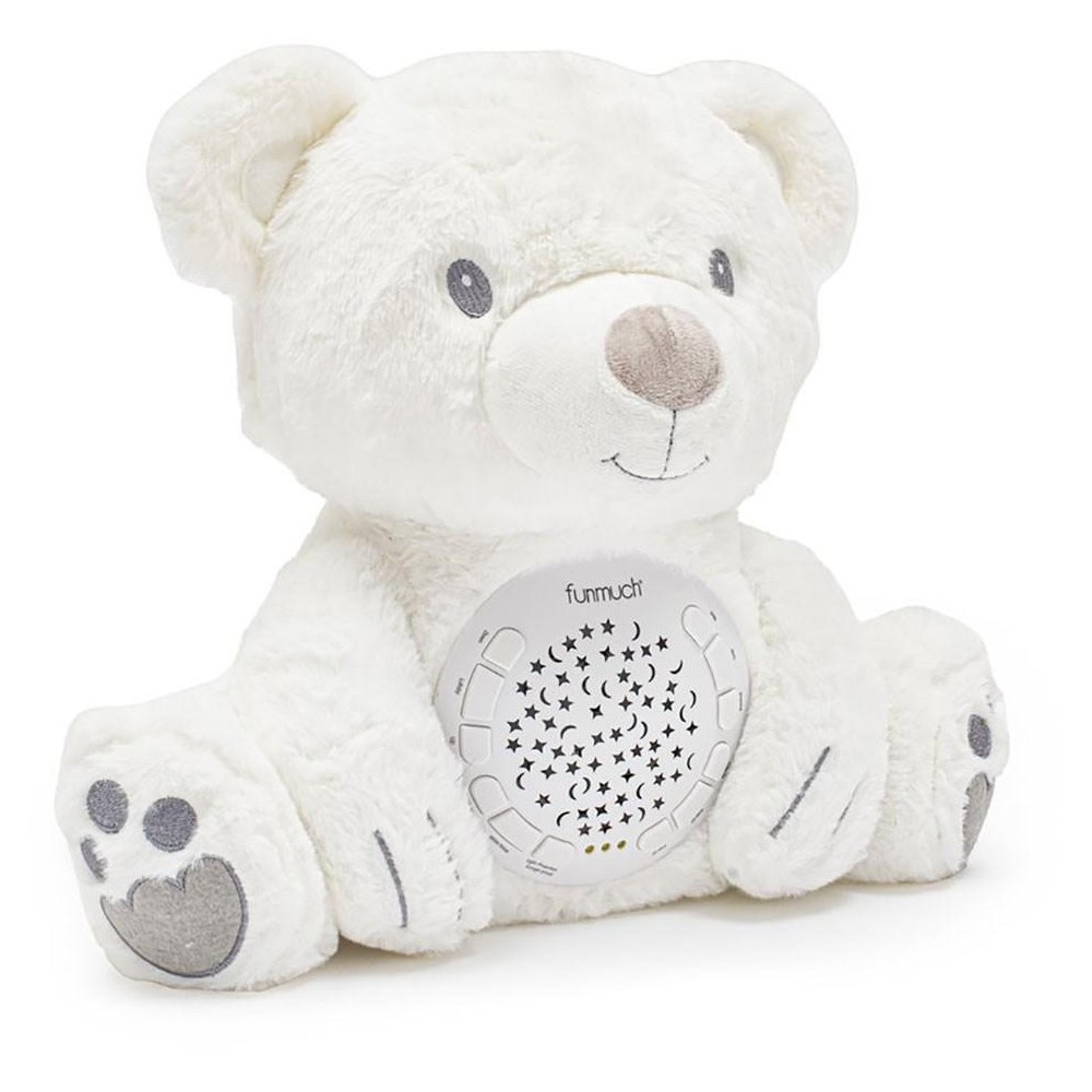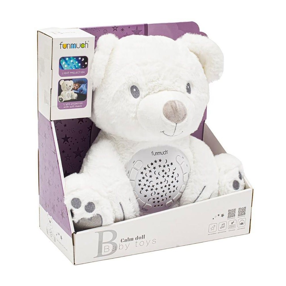 Plyšáček s projektorem je úžásným pomocníkem při uspávání dětí. Jeho design je měkký a pohodlný, ideální pro malé děti. Usínáček je vyroben z měkkého a příjemného plyšového materiálu. Plyšáček je vybaven projekčním zařízením, které na stěnu nebo strop promítá krásné barevné hvězdičky a měsíc. Usínáček má také funkci bílého šumu, která produkuje klidný šum, podobný šumu vln, deště nebo tichého větru a vytváří relaxační zvukový podklad pro uspávání dítěte. Kromě bílého šumu může usínáček přehrávat klidnou a jemnou hudba, která může být volitelně zapnuta nebo vypnuta podle preference. Baterie vložíte do plyšáčka pomocí vyjmutí bříška.