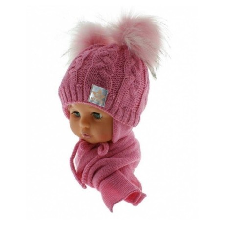 BABY NELLYS Zimní čepička s šálou - chlupáčkové bambulky - tmavě růžová, růžové bambulky