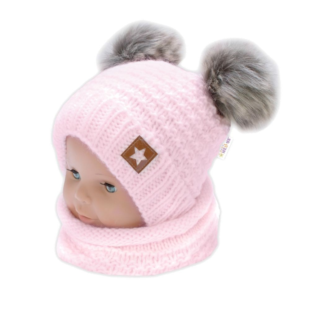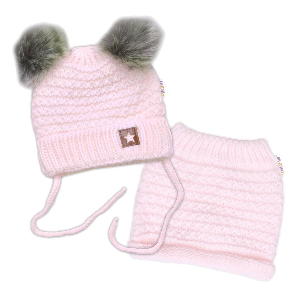 Zimní pletená čepice Star s fleecem a chlupáčkové bambulky+komínek 2D sada, růžová