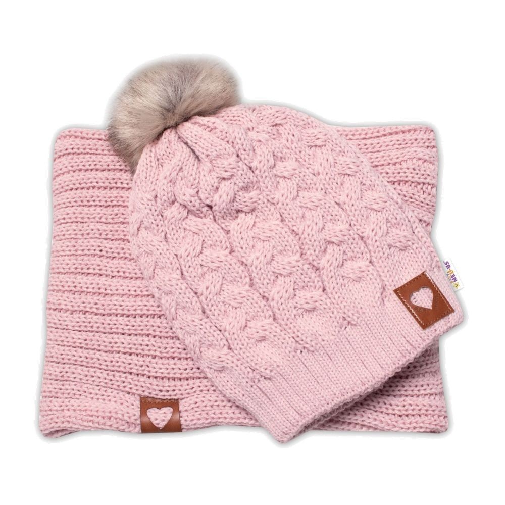BABY NELLYS Zimní dvouvrstvá čepice s bambulí + komínek Love, pudrová